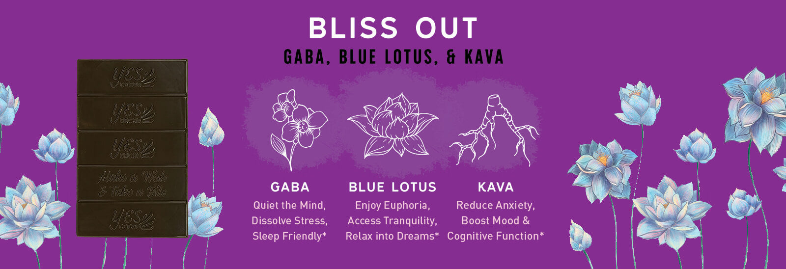 Organic Wild Cacao, Bliss Out Formula (Organic Lucuma, Kava, Organic Vanilla Bean, Organic Turmeric Extract (85-95% Curcumin), Organic Coriander, Organic GABA Tea, Wild Blue Lotus Flowers), Organic Wild Cacao Butter, Organic Raw CleanCaneā¢, Sea Salt