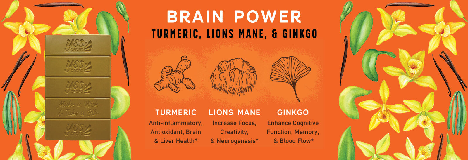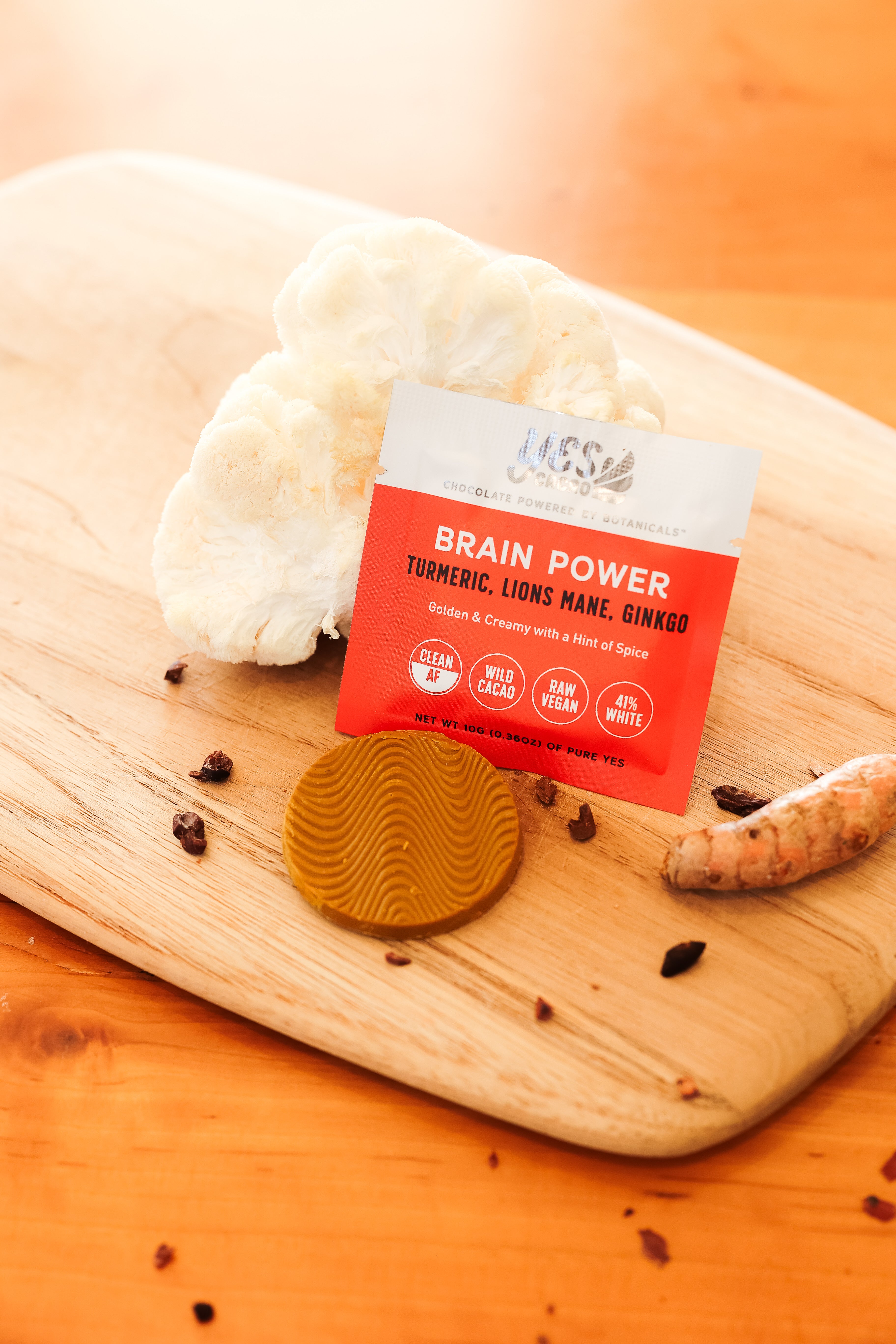 Organic Wild Cacao Butter, Brain Power Formula (Organic Lucuma, Organic Maca, Organic Mesquite, Organic Yacon, Organic Vanilla Bean, Organic Coriander, Organic Lion’s Mane, Organic Gingko, Organic Turmeric Extract (85-95% Curcumin), Wild Pine Pollen, Organic Cinnamon, Organic Bacopa, Gynostemma, Organic Raw CleanCane™, Sea Salt