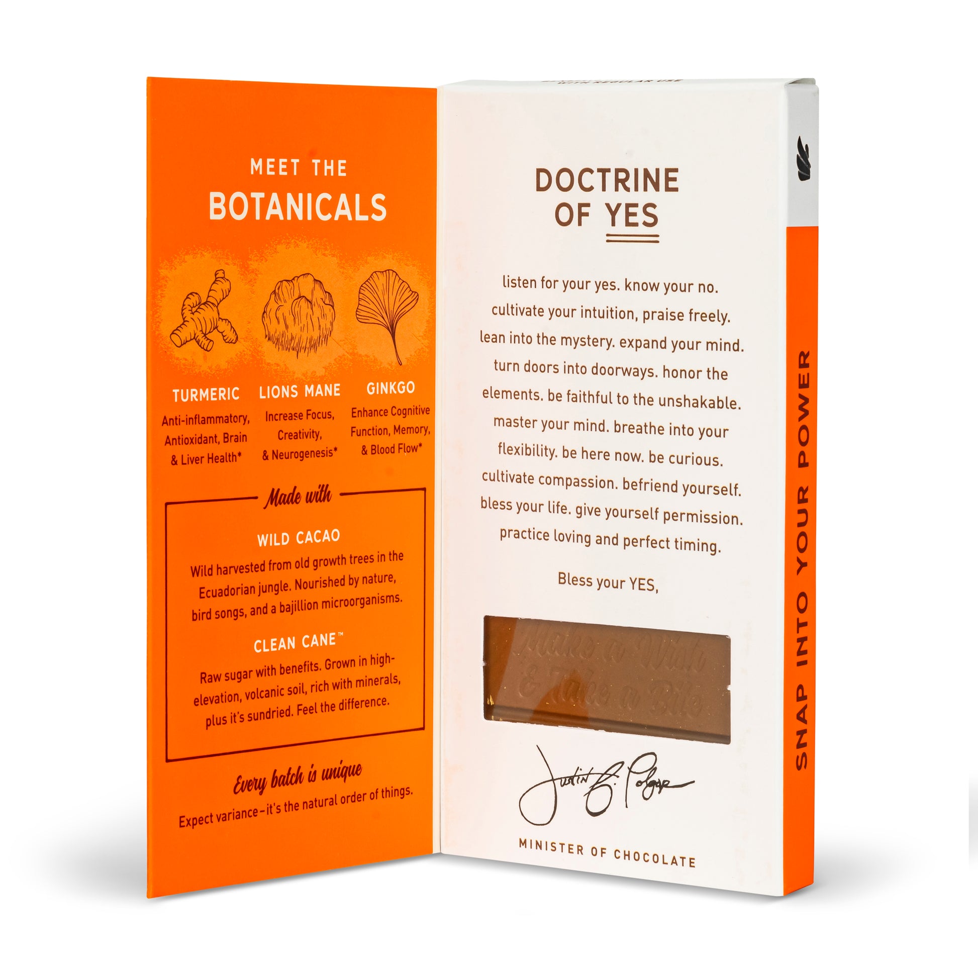 Organic Wild Cacao Butter, Brain Power Formula (Organic Lucuma, Organic Maca, Organic Mesquite, Organic Yacon, Organic Vanilla Bean, Organic Coriander, Organic Lion’s Mane, Organic Gingko, Organic Turmeric Extract (85-95% Curcumin), Wild Pine Pollen, Organic Cinnamon, Organic Bacopa, Gynostemma, Organic Raw CleanCane™, Sea Salt