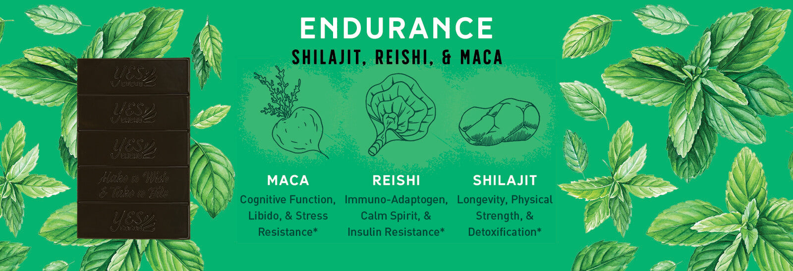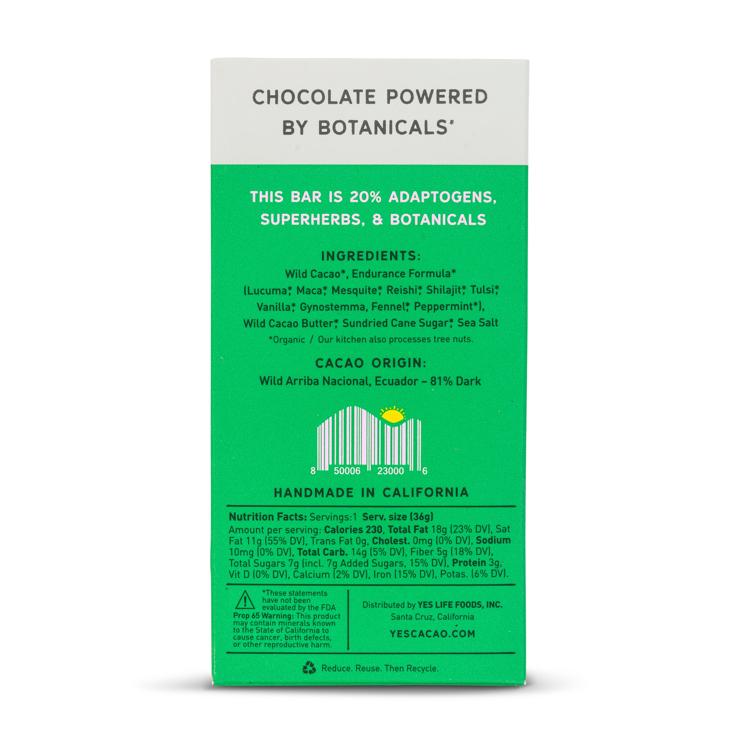 Organic Wild Cacao, Endurance Formula (Organic Lucuma, Organic Maca, Organic Mesquite, Organic Reishi, Organic Vanilla Bean, Shilajit, Organic Tulsi, Gynostemma, Organic Fennel Essential Oil, Organic Peppermint Oil) Organic Raw CleanCane™, Organic Wild Cacao Butter, Sea Salt